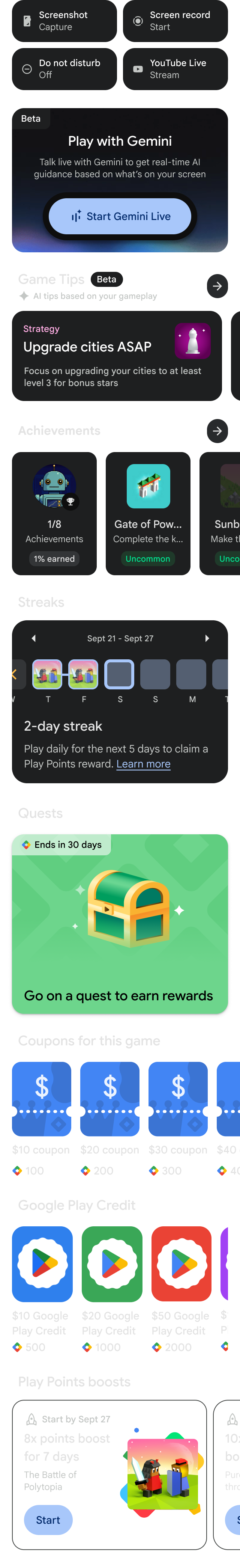 The Play Games Sidekick with Gemini Live is a new gaming companion that gives you easy access to your stats, achievements, and tips without leaving your game. You can also get real-time conversational guidance from Gemini Live while you play. Sidekick is only available while playing games downloaded from Play, and is coming soon to mobile.